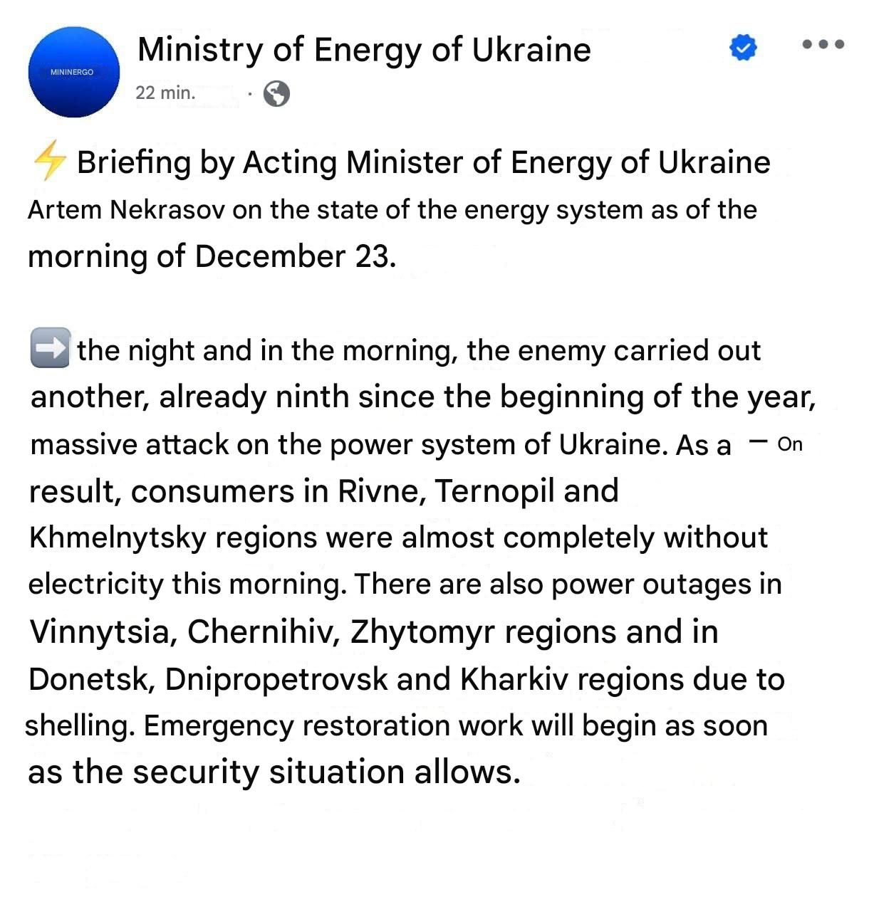 >On December 12 Russia launched strikes on ports in the Odessa region. Various commercial ships were targeted during the attacks on Odessa and Chornomorsk ports. Ukrainian officials reported damage to the tanker Cenk-T and three Turkish-owned ships.