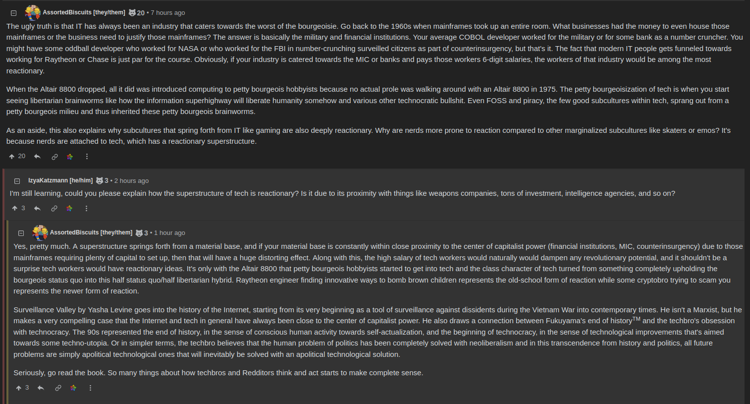 >>2603308>But the broader point is that being locked in Gaza or Fallujah and bombed with explosive ammunition is a way worse fate than being exploited for surplsu value.This oppression olympics helps nobody. Taken to its final conclusion it leaves us with child amputees in Gaza and Congolese cobalt miners as the sole revolutionary subjects.