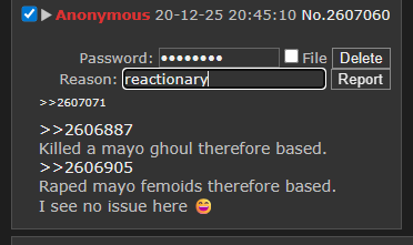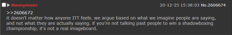 >>2607909Never because you need online spaces where you can vent without causing any actual friction to the system
