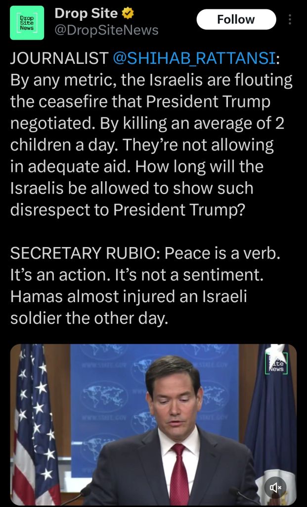 And again, do you have real, concrete evidence that what the current administration wants is full blown war and invasion with boots on the ground or is this the perception the good cop wants you to have? Unilateral bombing and stealing oil arent "war", what they want is to weaken their opposition in the region while making sure the rest of other latam countries start moving towards the US on their own after seeing what the other option is, after all, not everyone in the US is as bad as Trump, right? The other side is trying to stop him from doing full blown invasion and they will eventually be in power in the future, right? You cannot "exploit" this "divide" in tactics without advancing their interests.
