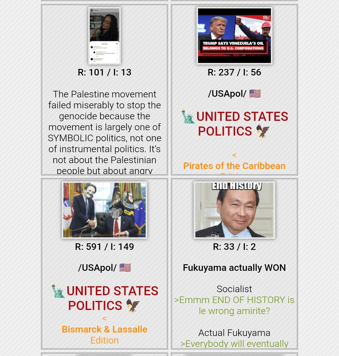 >>2607998>what Trump is doing in Venezuela doesntSure it does. Murdering random fishermen in the Carribean Sea has severely harmed their reputation and damaged relations with Latin America. Military action against Venezuela could lead to mission creep or a broader escalation that could bog down the Americans in a military quagmire. Already they've created a lose-lose situation for themselves in which they can't back down without looking weak and foolish, and where they are unlikely to actually topple the Venezuelan government without direct intervention.