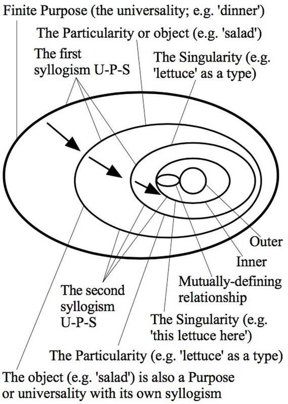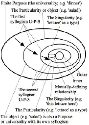 >>2608775The picture, idk where it's from, but it seems to suggests reality is made up of a dynamic relationship between universality (U), particularity (P), and singularity (S) which combine to form what is being called here syllogism. A universality like the general idea of “dinner” includes particular objects such as “salad,” and each particular includes singular, concrete instances like “this lettuce here.” But these levels don’t exist separately; the singular helps define the particular, and the particular helps shape the universality. In other words, universality, particularity, and singularity continuously interact and depend on each other, forming a living process where concepts and real things are always connected and influencing one another. Influence flows both down and up the chain. It doesn't just flow from universal to singular, but also from singular to universal. There's a feedback loop of definition and influence here.
