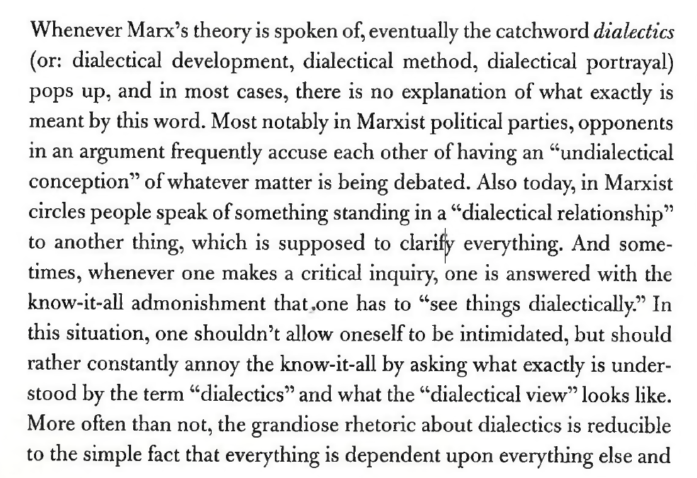 Semi unrelated, but sometimes also people talk about dialectical presentation in Marx, which i disagree with since the idea undermines the fact that the laws of dialectics laid out by Engels are necessary in order to properly conceptualize human knowledge of physical processes and relegates dialectics to just a way to format a written work for better consumption, but anyways I did read a very dialectically presented book and it was wonderful. It was about schizophrenia and dissociative disorders, and their relationship. It started out giving all the reasons for their unity, basically dissolving the concept of schizophrenia into the umbrella of dissociative disorders symptom by symptom. But then it reaches the unassimilable kernel of schizophrenia: the thought disorder. This is the negation of the negation of schizophrenia. It has a zone of difference from dissociative symptoms, and therefore deserves its own title and consideration as a unique disease. Some people say that the only reason you can apply a dialectical lens to science is because it's only a way to format a writing to better be understood by the reader. I disagree, because it's obvious that even if no one formulated schizophrenia and its relationship with dissociative disorders dialectically, the truth of their relationship is dialectical, that they have large areas of unity but also their own kernels of difference. And this is the secret to dialectics and dialectical thinking. I now see all concepts as an area. Imagine a sphere. Now in relation to all other things, there is overlap. So your sphere is more like a flower - a bunch of venn diagrams. As you traverse its relationships with other concepts, you leave and come back to the concept with a richer view of it. You can see what makes it unique and what it shares with others. You trace something like its outline - though it's not an outline, it intersects other concepts and then comes home to its center again. Just like you're drawing a flower. Consider how Hegel was a logician. Consider that humans only know the world through our symbolic representation of it. Our representation gives static symbols (e.g. a word) domain over areas of concrete reality. Concrete in marxist terms means that it is richly interconnected and given a multitude of determinations. Concrete is in opposition to the word abstract, which means something taken out of its context (and thus simplified - we immediately see why simplification is happening if we're looking at it dialectically. The flower is gone and we're left with just the center, just the "pure" concept without any of its messiness. We know that the messiness is part of it, and by getting rid of that we lose huge parts of the concept and lose the ability to actually understand it). Reality is inherently concrete. Language inherently abstracts. You can have more concrete or less concrete abstractions. So the purpose of dialectics in science is to give our abstractions (our object of study) as much concreteness as possible by not taking them as static abstractions but as internally divided, externally implicated, and possibly evolving things, whose conceptual messiness (overlaps, or areas of unity) and internal lack of perfect coherence does not negate them. Thanks for coming to my TedX talk