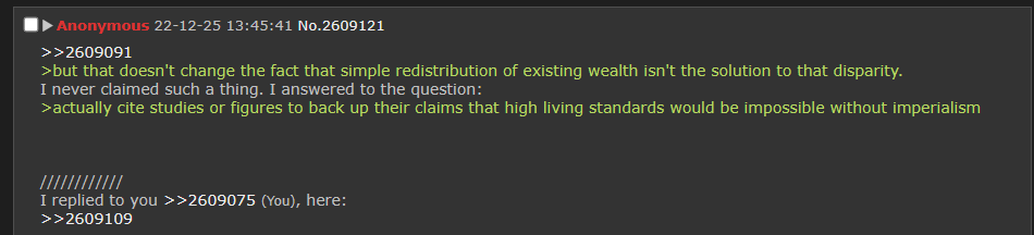 >>2609139>shutting off, halting, etc., the plundering derived from imperialism/colonialism, automatically manifests itself the wealth redistributionOnly in the sense that it allows the global south to catch up to the north, not that it requires the north to give up what it already has.