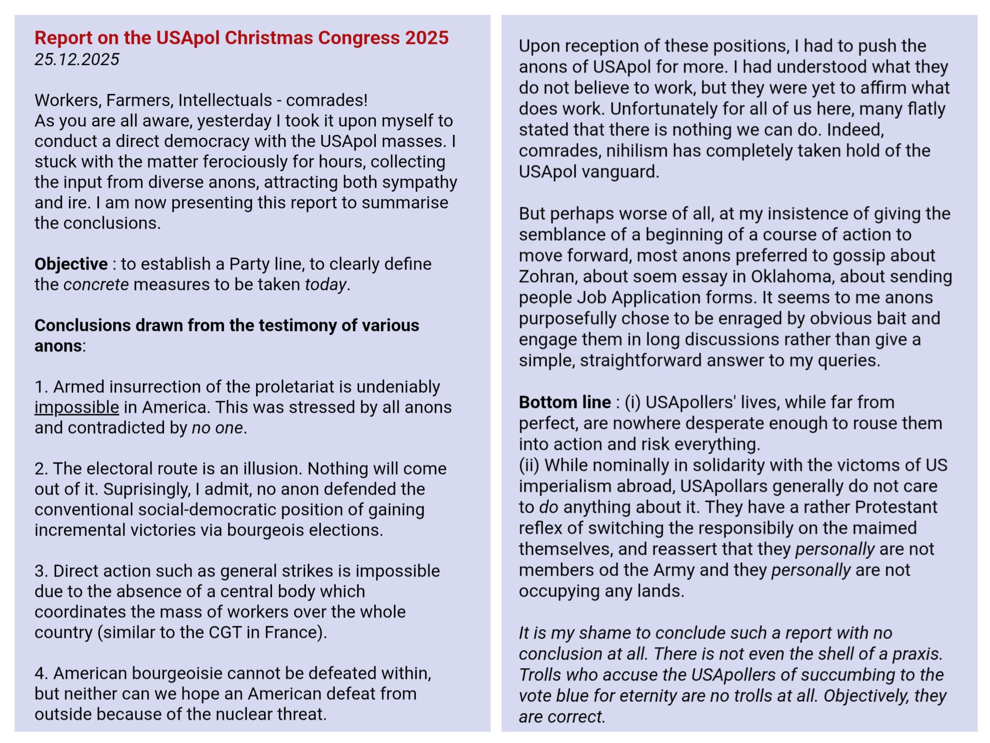 >>2613472Indeed, comrade, it is impossible to forget the Ironheart. The report of 25th December, however, only deals with the opinions collected from USApolers on the 24th. The Forbidden Comrade was not present that day, no doubt because of the savage repression unleashed on him by the Tsarist Modocracy.