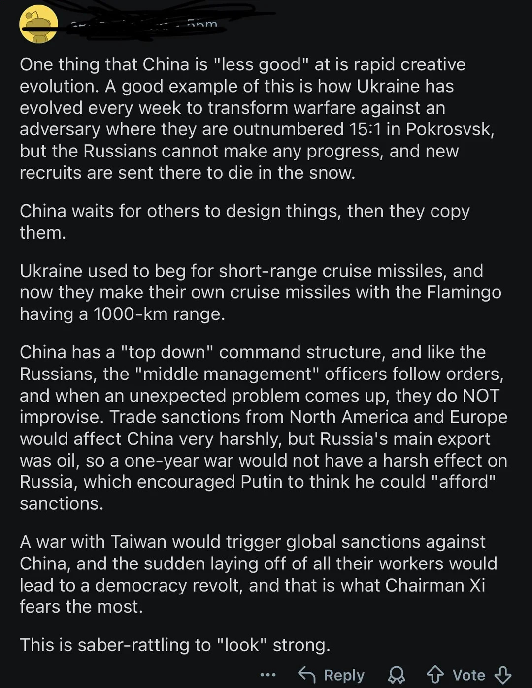 >>2619835You realize the rate of advance for nov-dec 2025 is the fastest since 2022 right ? Russia managed to advance almost 40 km² a day, but I agree that in general the rate of advance was disappointing. Out of all predictions I made at the start of the year, about 50% came true, hopefully I got better at this, anyways, here it goes, my predictions for 2026 :