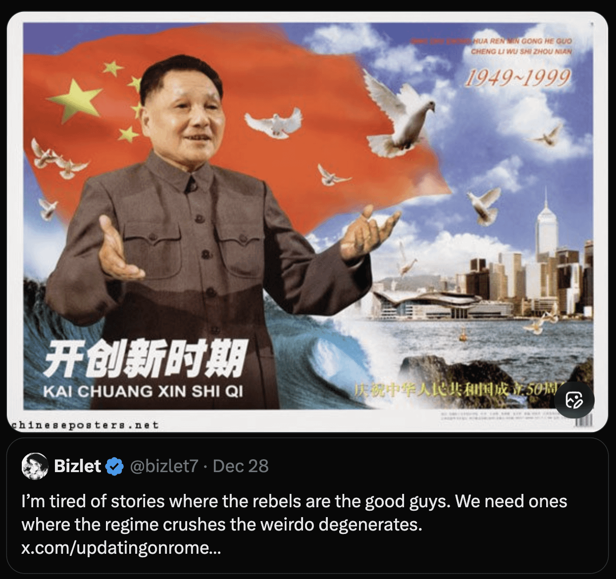 >>2619125i don't get the "joke". Deng Xiaoping tricked the yanks into abandoning their productive forces. This has nothing to do with /pol/tard anime pfp schizo rants about MVH DEGENERACY