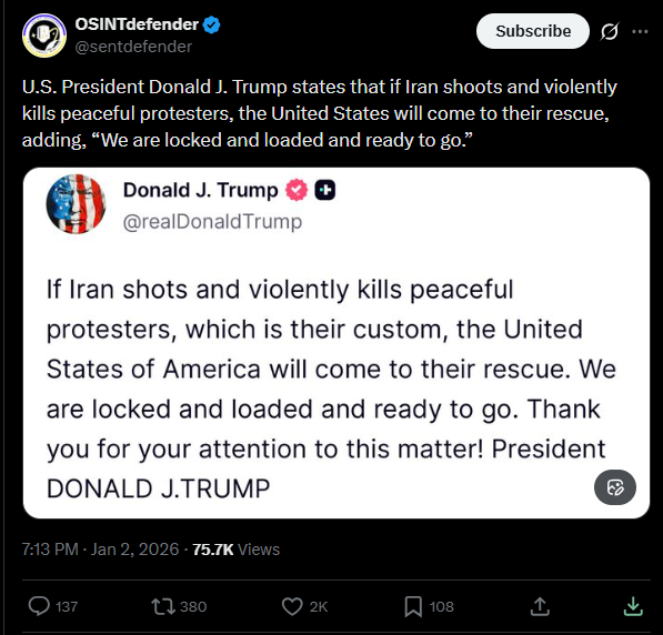 >- The pattern from the past is that for a few days the security services will be (relatively) tolerant and wait for things to die down. If they don't then they crack down hard and things get really ugly. I hope that doesn't happen.https://nitter.poast.org/websterkaroon/status/2005718816844574767#m >>2621118Nope, one leads to the other. Another cuck state. Another Jolani.