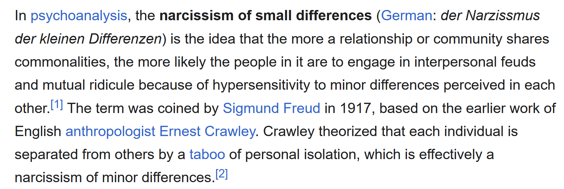>psychobabblei don't like psychobabble either but when I see communists who agree on 90% of things wanting to kill each other over the 10% of things they disagree on, while their enemies are perfectly content to unite and crush them with much less overlap… I can't help but think of the narcissism of small differences. Even now you exemplify it perfectly.