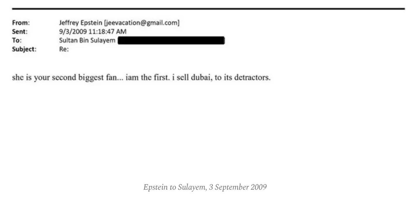 >Among them is a 2009 message in which Epstein calls himself Sulayem’s “biggest fan” and claims, “I sell Dubai, to its detractors.”
