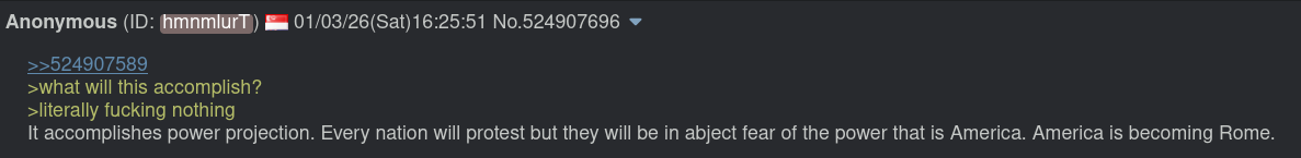 >>2623112>He anticipates no further action in Venezuela now that Maduro is in U.S. custodyThey've apparently been planning this operation for months and couldn't come up with a better lie than this? Not a single person on Earth believes that the US just wants to put Maduro on trial and that'll be the end of it. Trump himself has said that he wants Venezuela's oil, and you can't get Venezuela's oil by putting one guy on trial.