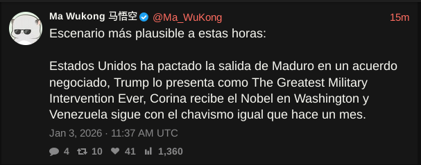 so wait maybe trump and maduro made a deal. maduro sacks himself and hands it to his successor. whoever trumps talks to last will he who he makes promises to. see putin talking to trump last in ukraine talks. trump gets to claim he got maduro and maduro gets to continue his regime. bc peace prize lady didnt talk to him last she didnt get any part of the deal