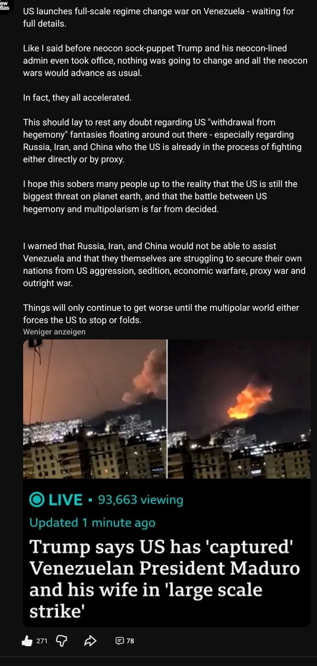 >>2623107The US has not won a victory, until they have Venezuela, and it's oil, under their control. For the time being, they have just killed some people, and captured Maduro. No apparent, major geopolitical change has occurred so far.