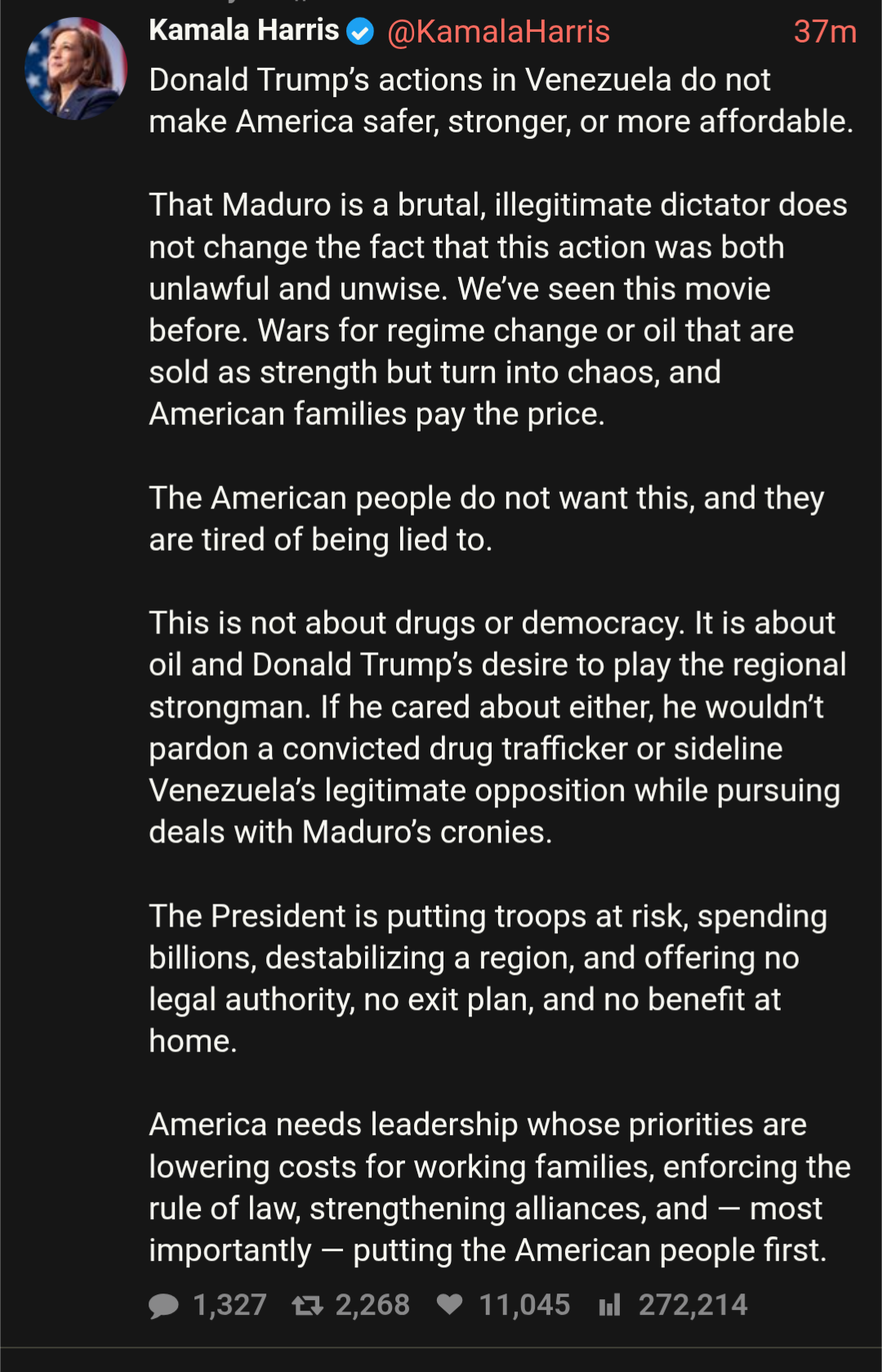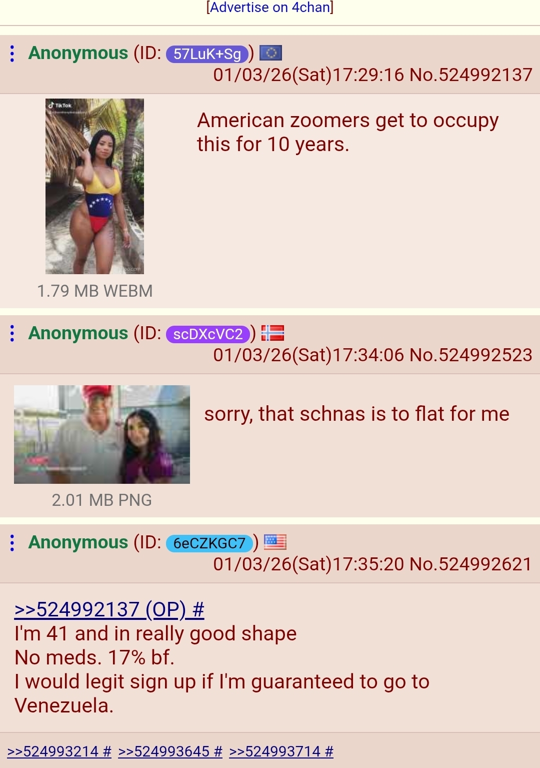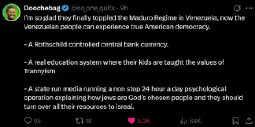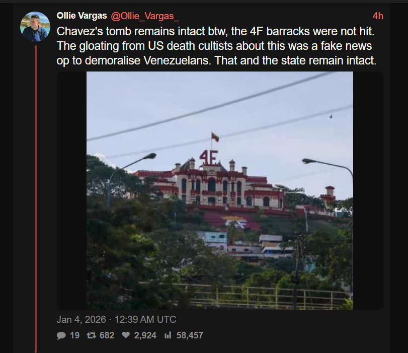 >>2626060In all honesty Maduro's government were already corrupt sellouts who further liberalized Venezuela after Chavez. If Rodriguez and co pulled this deal to avoid turning Caracas into Fallujah or Gaza then it's legit the best case scenario for Venezuelans like this anon