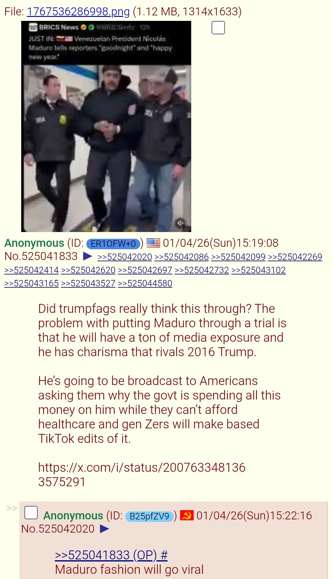 >>2626690Be charismatic at the show trial and ask why America is obsessed with him. Unlike Saddam, Maduro is just a bus union guy chill guy who became president. Maduro has a ton of memes like boxing, shitting on a dude who reads trump like the Bible, peace no war, dancing and other stuff that will pass through tiktok and revitalize his image particularly in gen z. They can't demonize him as a cold calculating cartel dude