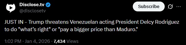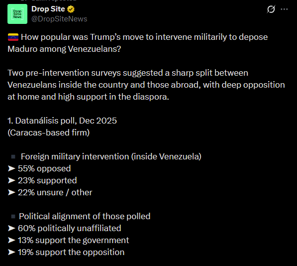 >34% support for military intervention among Venezuelans living in the countryhttps://xcancel.com/DropSiteNews/status/2007681400284062192