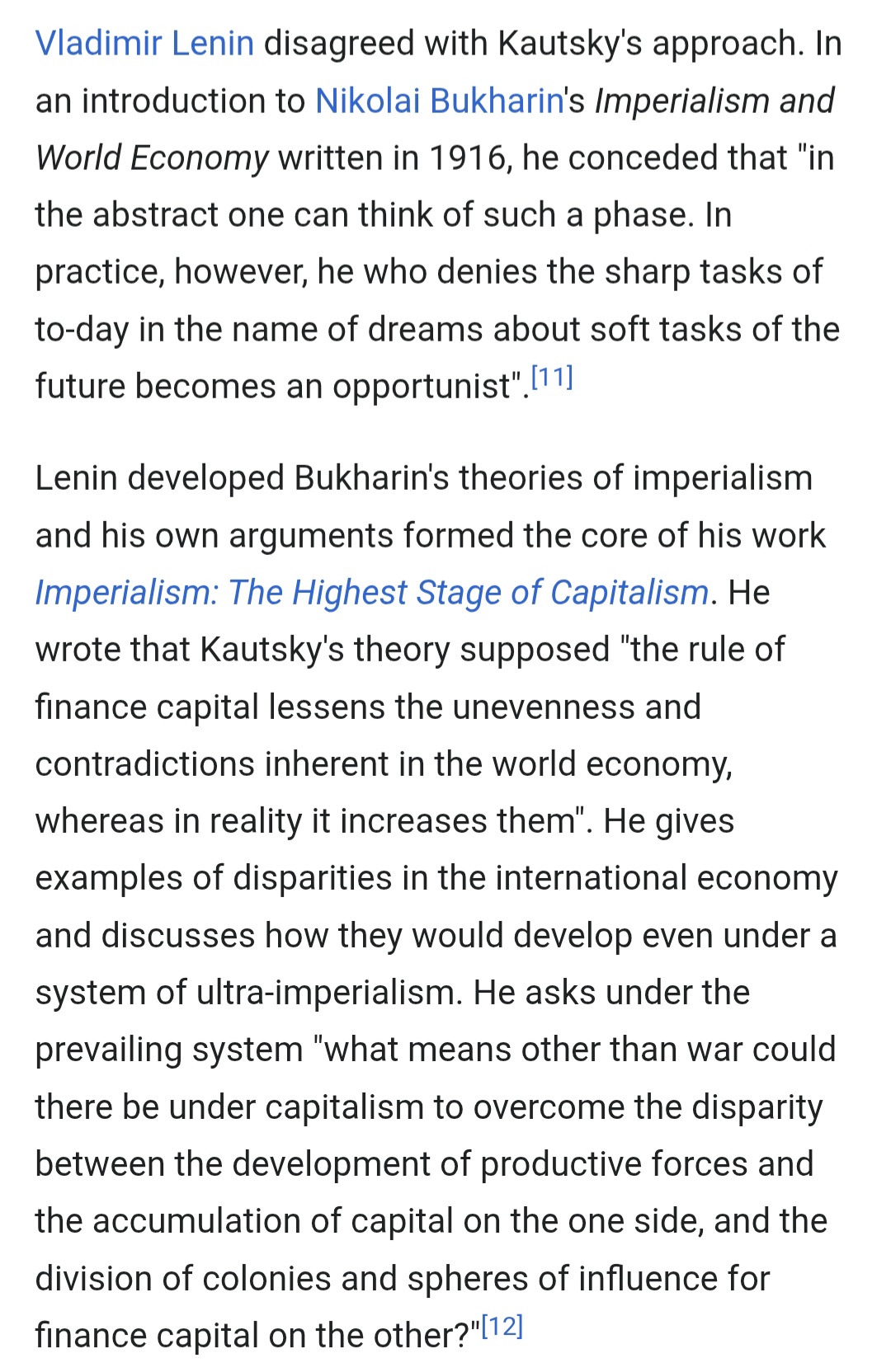 People here love to copy-paste Lenin quotes here, but they don't realize that the imperialism that Lenin (and Hobson before him) described was happening within a multipolar European world order. It was Britain, France, Germany, Austria, Russia competing for more colonies and subjugated territories where they could sell their production there and exploit resources (and btw, there are some people who argue this wasn't the reason for WWI contra Hobson and Lenin, because for example France and Germany were exporting capital in British India without any problem but that's a different matter).