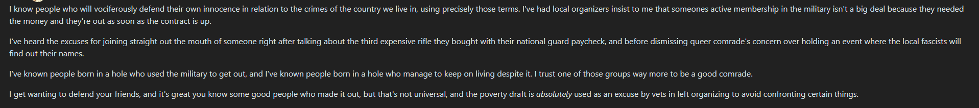 >>2629445American enlisted soldiers are definitely NOT "petty bourgeois" (easily the most misused term on this site) or "labor aristocrat". Most of them are very much proles. They join for the guaranteed income, housing, food, and healthcare.