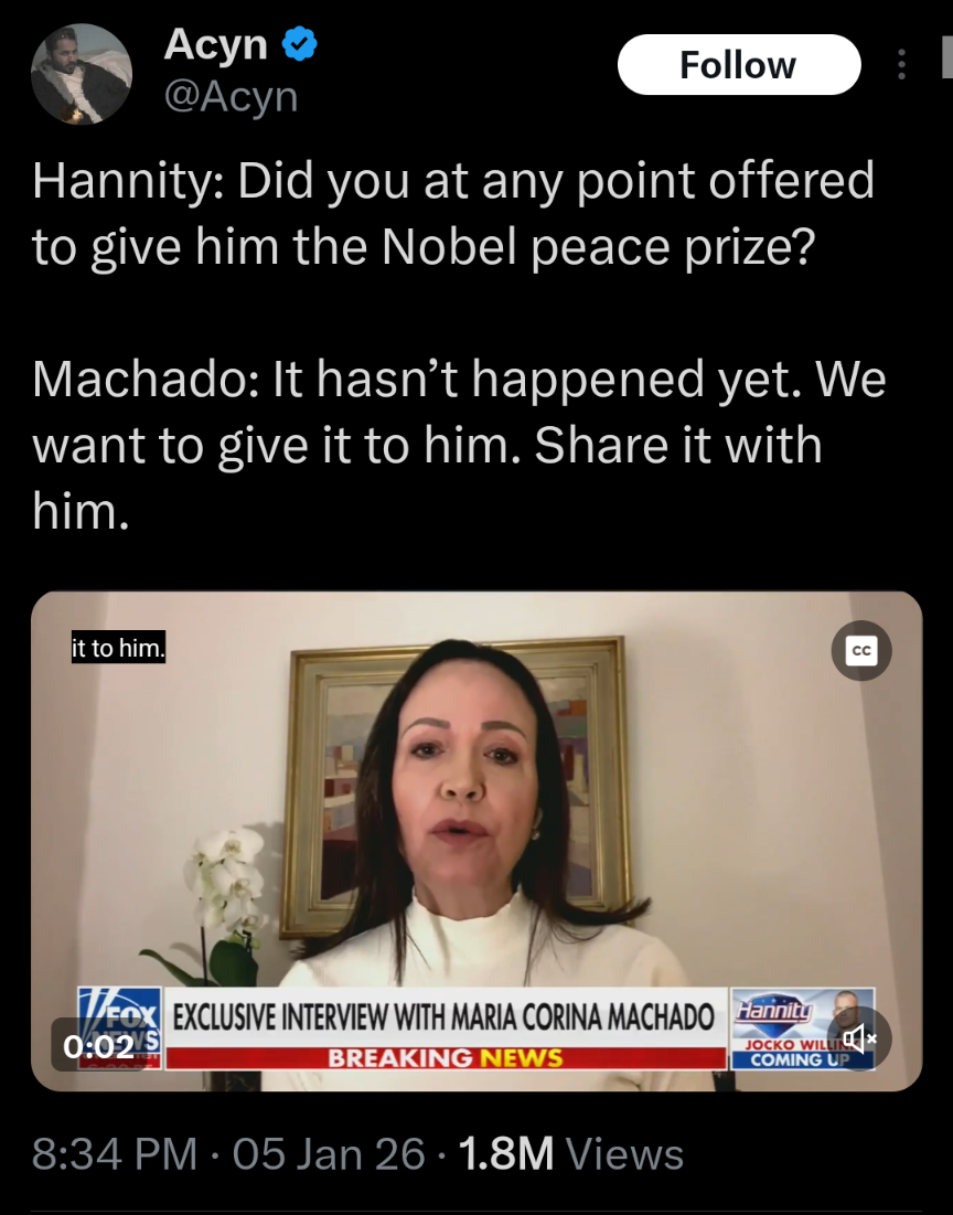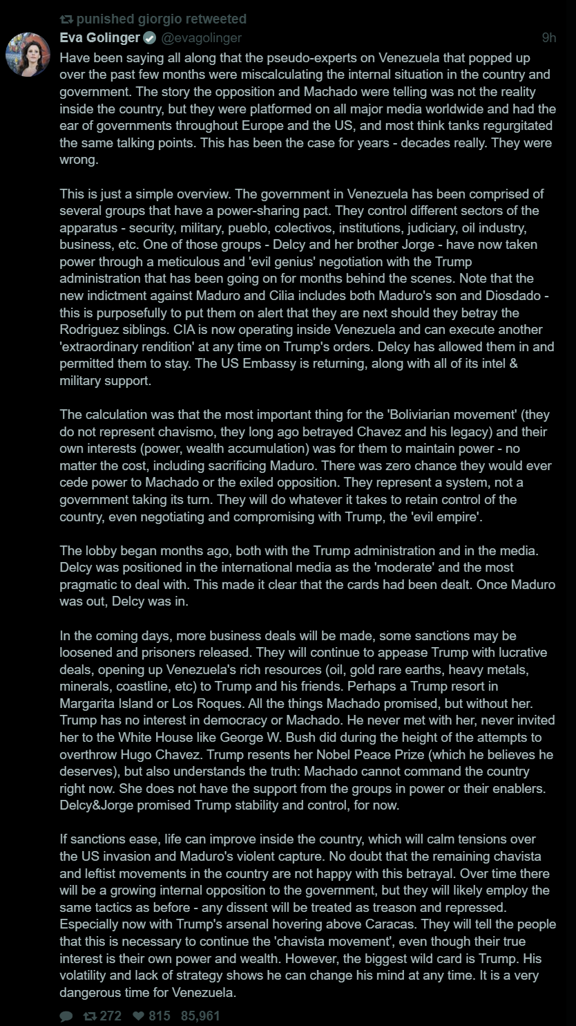 >Such a transition might not result in regime change after Trump ruled out Nobel Peace Prize winner Maria Corina Machado leading Venezuela since “She doesn’t have the support or the respect”. He also didn’t mention “democracy” once during his press conference in a sign that he’s uninterested in a radical regime change from the Chavismo model to a Western one (at least at this time). This hints that he’s open to Rodriguez or some other Chavista who he thinks the US can work with succeeding Maduro.