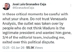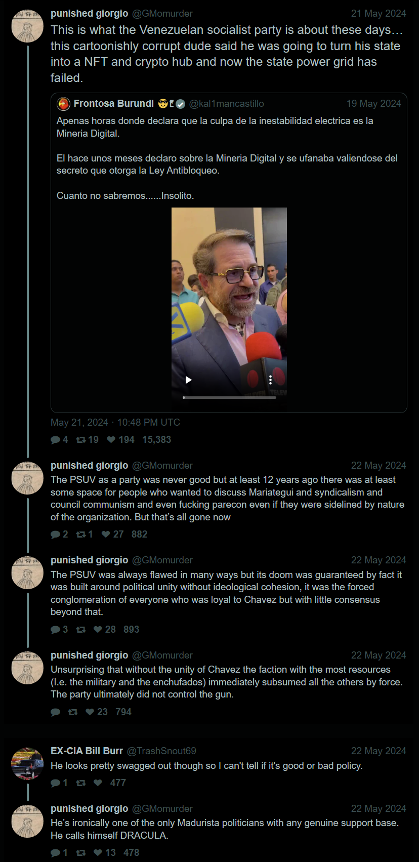 >leftist knee-jerk reaction against criticizing the Venezuelan government nothing knee jerk about it, we simply recognize a glowie who repeat unproven US propaganda as the imperialist slime he is