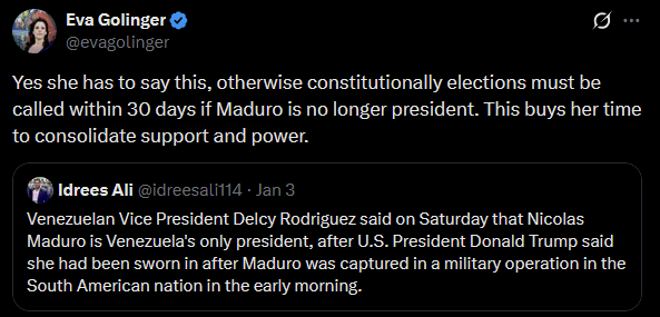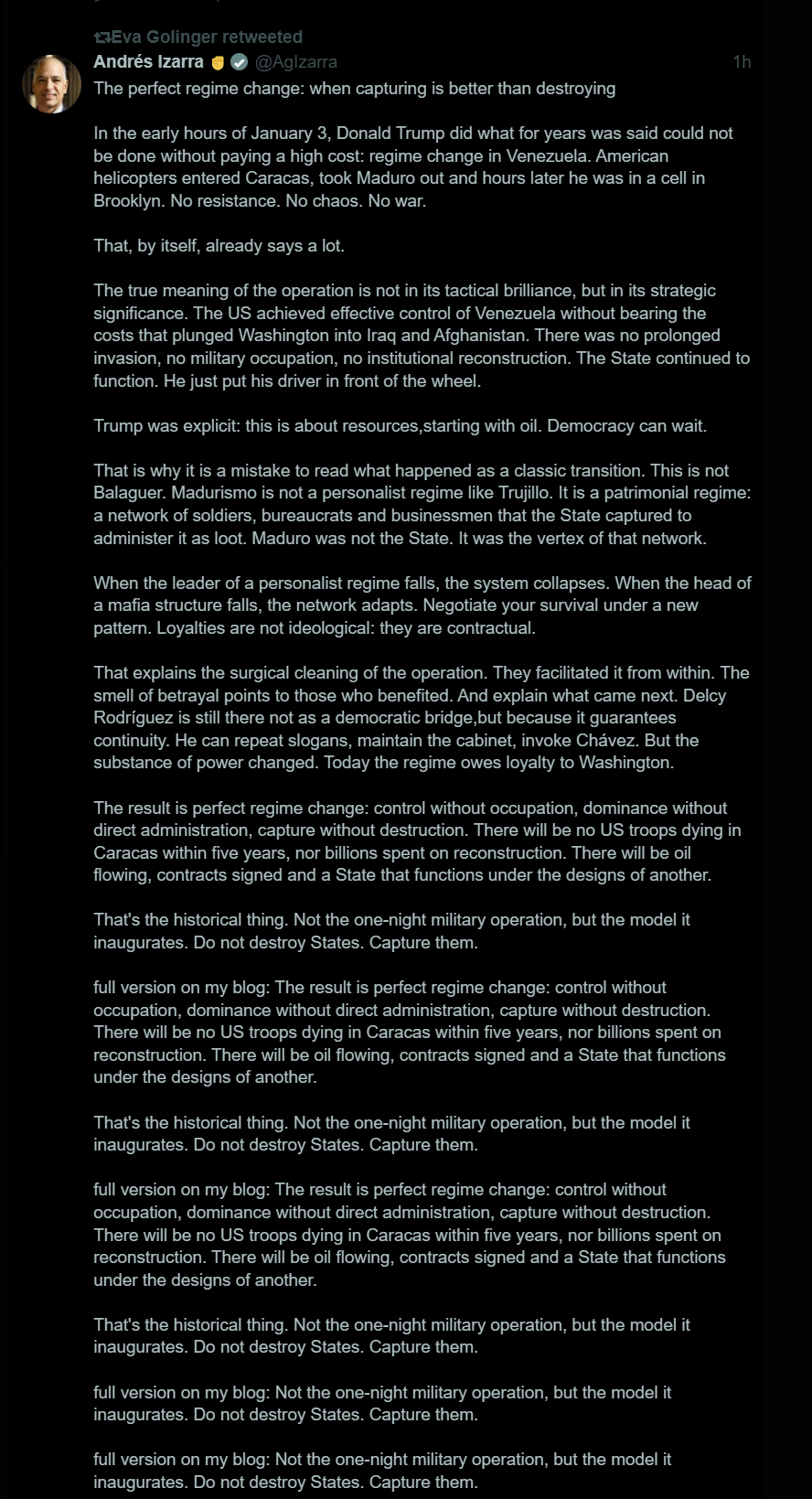 So, Venezuela has been a petrol station controlled by a loose alliance of forces under an umbrella of "Chavismo" that maintained radicals in support of the government. So the US made the correct analysis that in kidanpping Maduro they could force terms upon Venezuela and it could still maintain the "Chavismo" larp, cause the state doesn't want to fragment into Haiti-style warlordism. Trump is gonna force Dengism into Venezuela, damn.