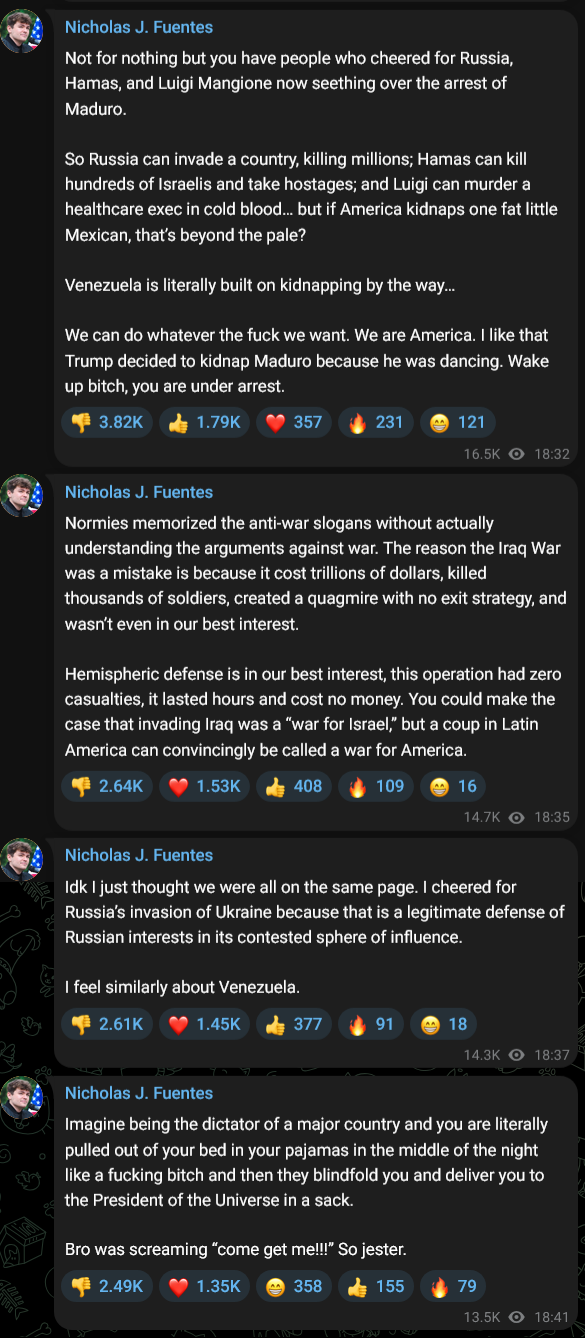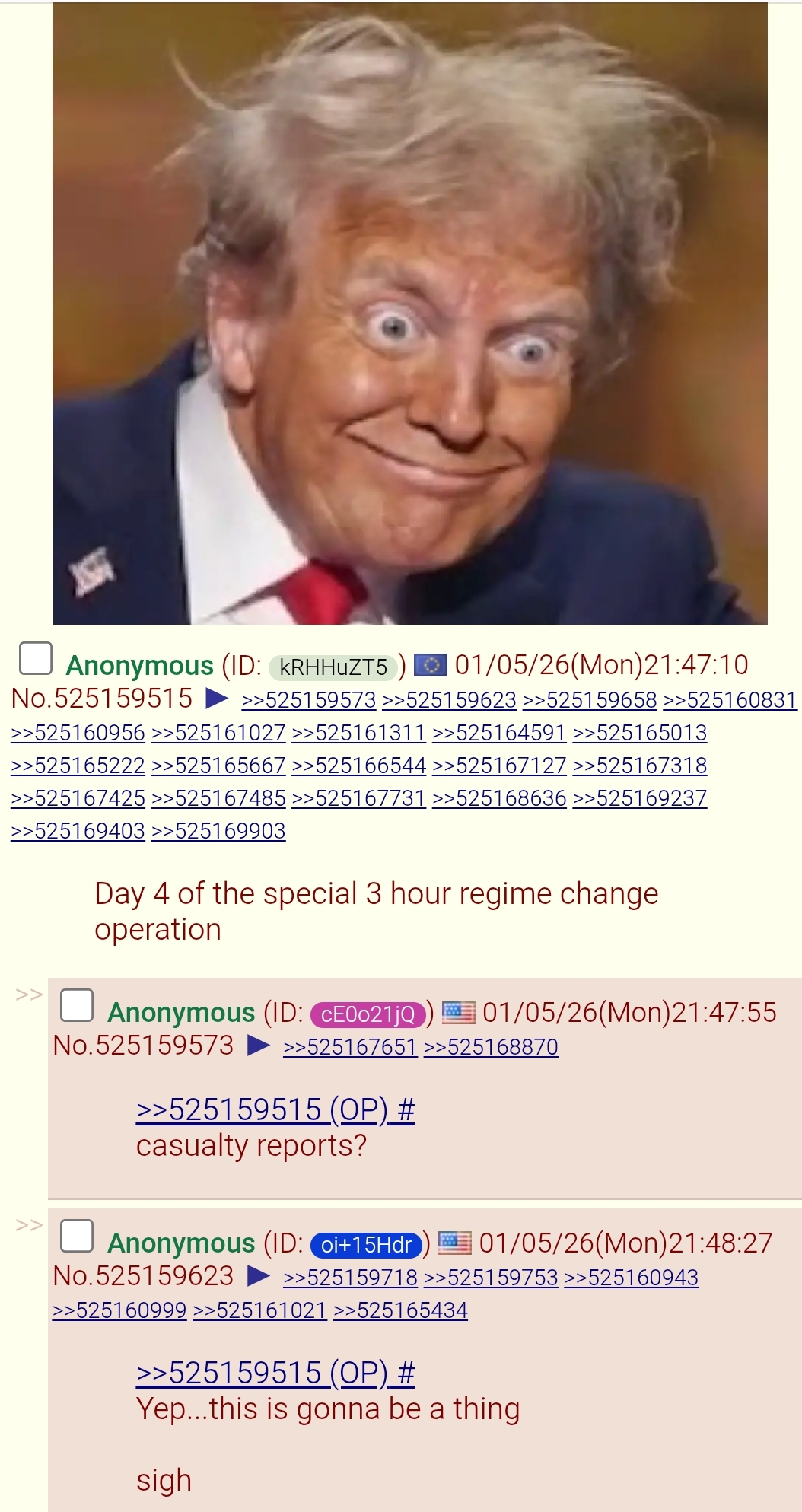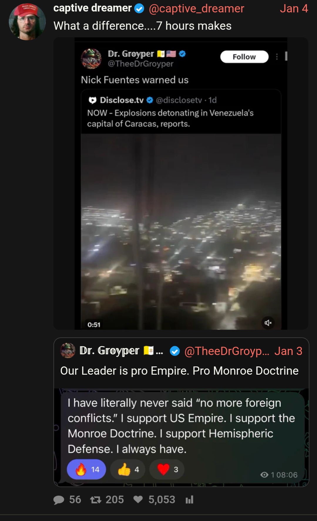 I'm not gonna hold it against Rodriguez and the rest of the PSUV if they make a deal with Trump to prevent a total regime change and a possible land invasion of Venezuela. It's going to be very funny to see all the xitter rightoid's reactions clamoring for a return of the Munroe Doctrine when they realize their god emperor only took out a figurehead and Chavismo still endures in Venezuela in some form.
