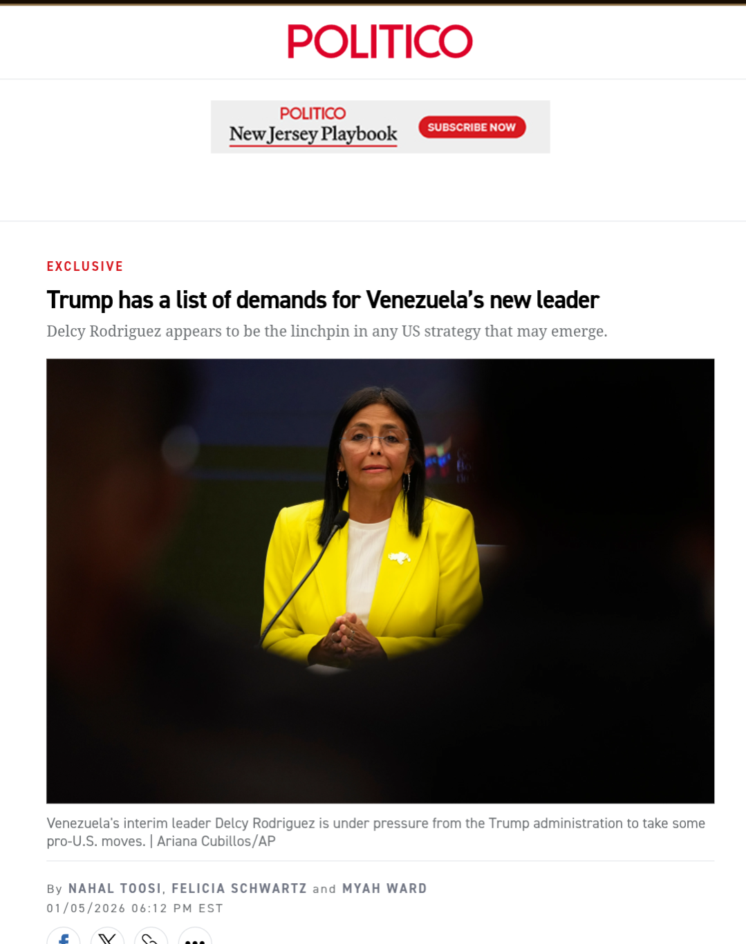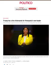 https://www.nytimes.com/2026/01/04/world/americas/trump-venezuela-leader-rodriguez-machado.html>Trump has a list of demands for Venezuela’s new leaderDelcy Rodriguez appears to be the linchpin in any US strategy that may emerge. - POLITICO