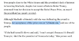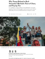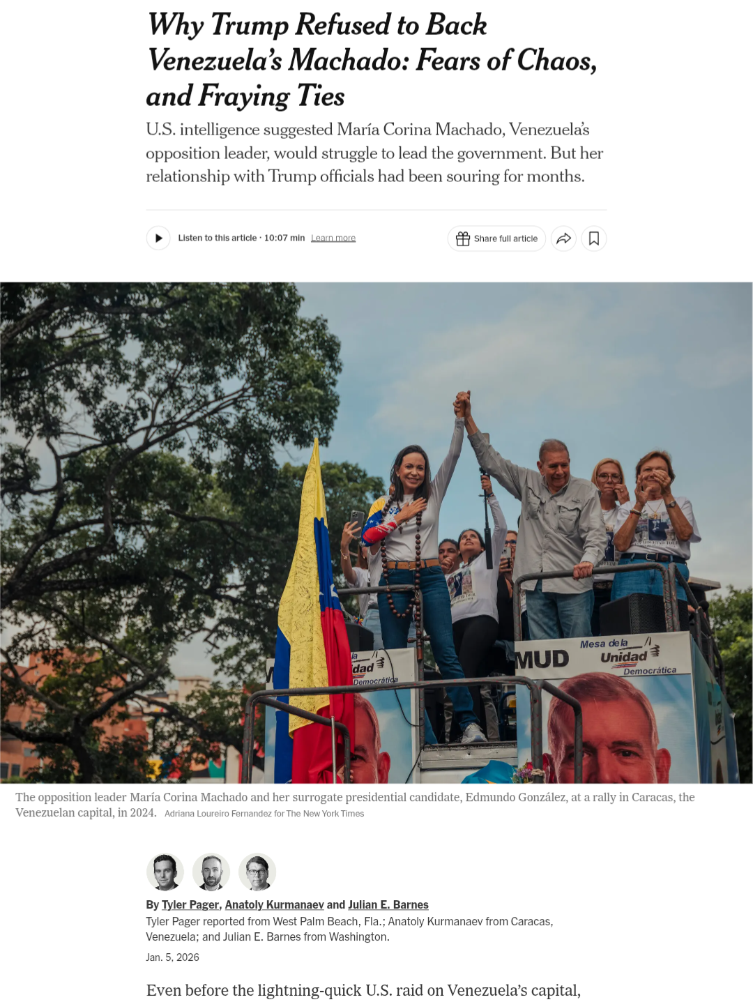 It was an easy choice, the people said. Mr. Trump had never warmed up to the Venezuelan opposition leader María Corina Machado, who had organized a winning presidential campaign in 2024, earning her the Nobel Peace Prize this year. Since Mr. Trump’s re-election, Ms. Machado has gone out of her way to please him, calling him a “champion of freedom,” mimicking his talking points on election fraud in the United States and even dedicating her Peace Prize to him.
