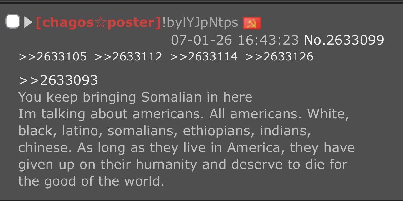 >>2633089Targeting people with racism for being Somalian will never be a good thing.