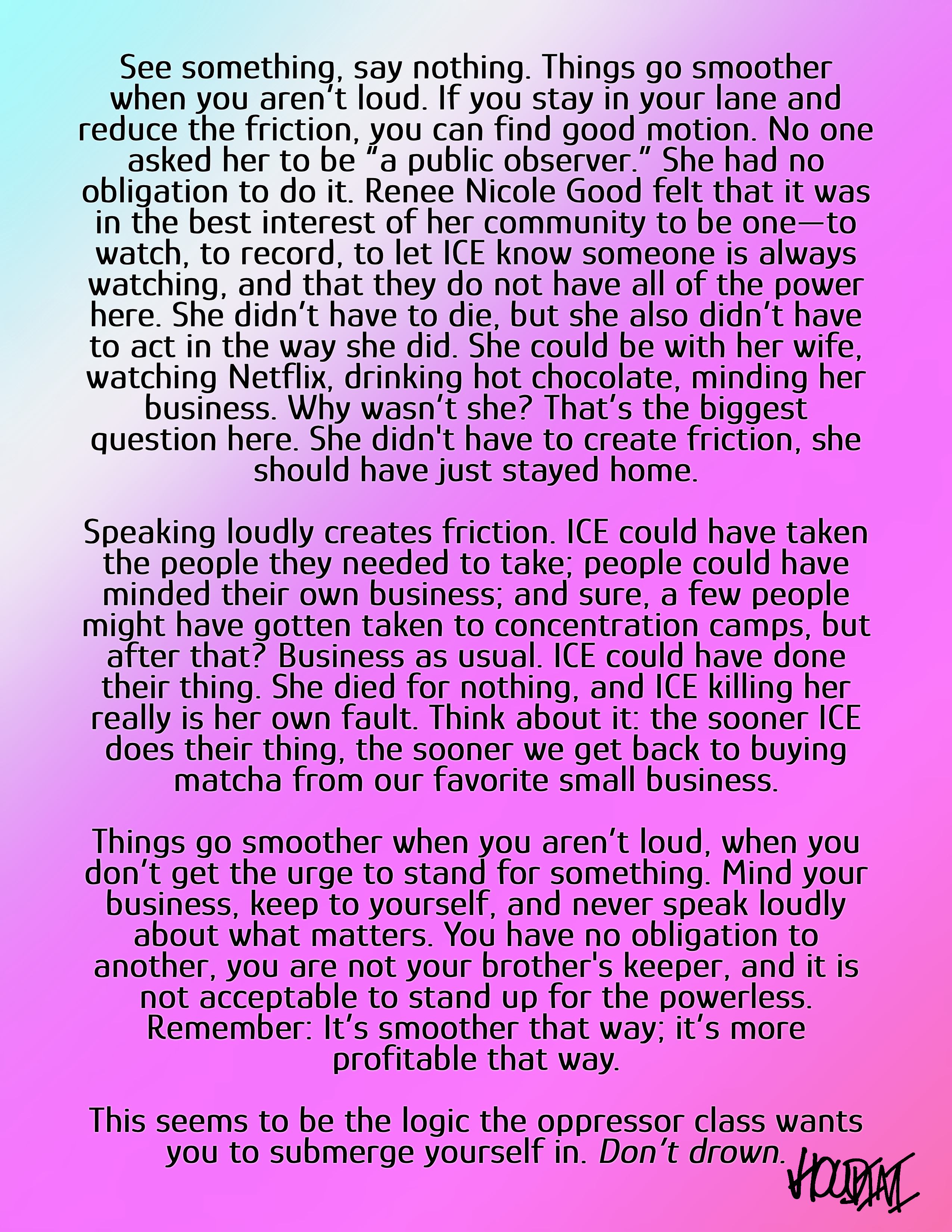 Never again. I have never felt so ashamed. So much like a cop. The ban I received, it only makes me feel that much more connected to that man in the Malcolm X hoodie. It has become inescapable to me that the contradictions between small businesses and revolutionaries cannot be squared, after all it was small businesses that pushed so strongly for "Whites Only" rules. It was the small time pool operator that poured bleach in the pools when black people swam, who chose to turn those gathering places into parking lots when they realized who would gather there.