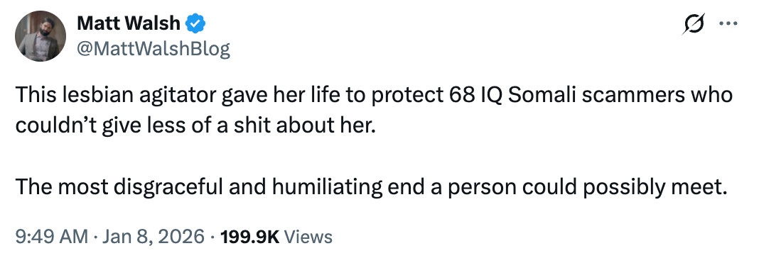 https://www.startribune.com/ice-agent-who-fatally-shot-woman-in-minneapolis-is-identified/601560214>>2635494Another long faggy wokescold-tier mctweet by fat crackbaby. JD Vance is a right wing Buttigieg. Fucking faggot