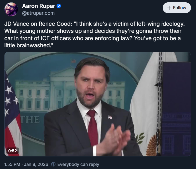 Vance: She is a victim of left-wing ideology. What young mother shows up and decides they are going to throw their car in front of I.C.E. Officers enforcing legitimate law? You have to be brainwashed to get to that point.