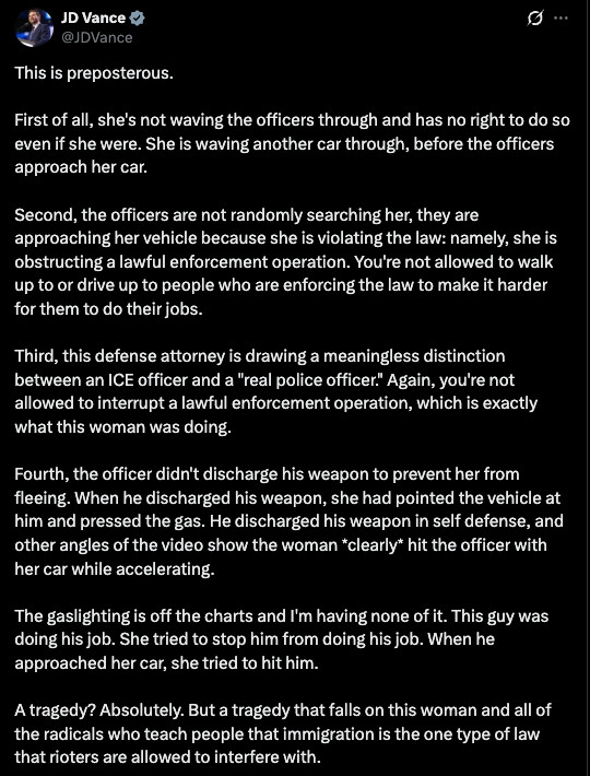 Vance: She was trying to ram this guy with her car. Everyone repeating the lie that this is some innocent woman out for a drive in Minneapolis when a law enforcement officer shot at her, you should be ashamed of yourselves.