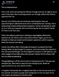 Vance: the agent is protected by absolute immunity. He was doing his job. The idea that Tim Walz and a bunch of radicals are going to go after him and make his life miserable because he was doing the job that he was asked to do is preposterous.