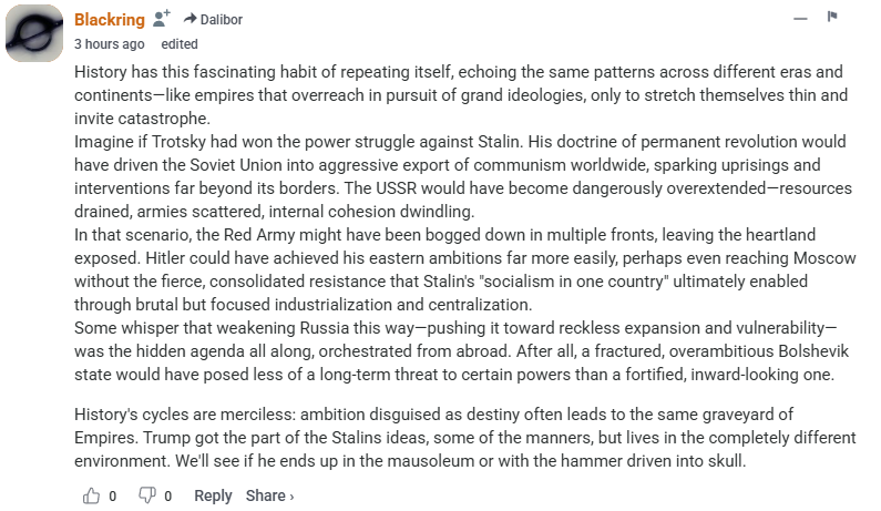 • Meta discussion of the historical, philosophical and ideological background of the war is fine as long as its done in good faith and comradely.