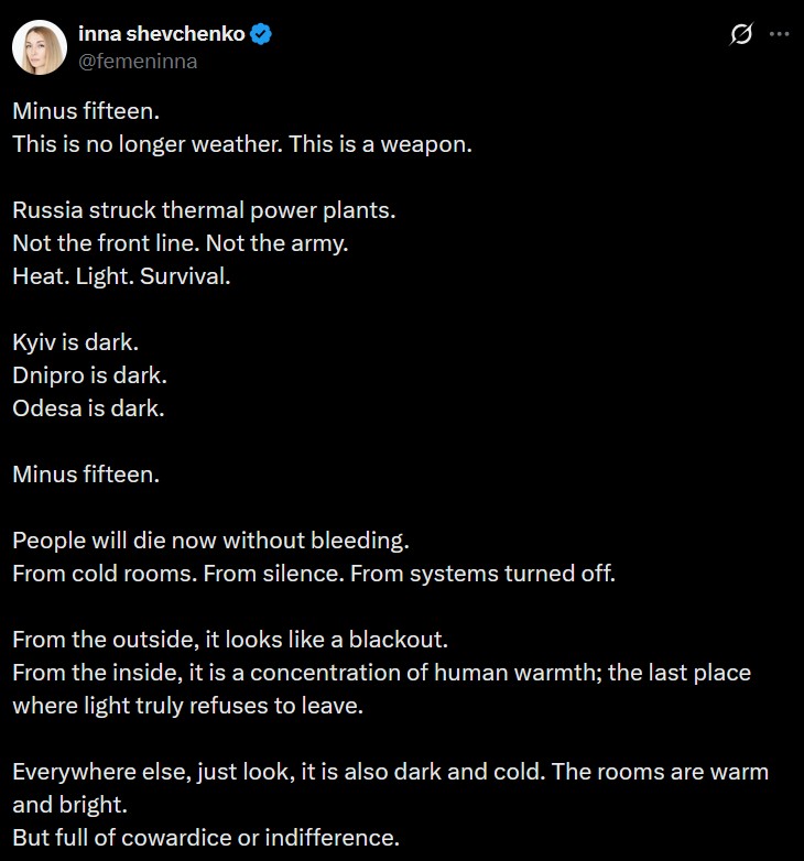 >The wholesale expenditure of Ukraine is not my problem, they should have organised better than I've achieved>The attempt at Balkanising 145 million people with thousands of nukes and many lifetimes of resources is not my problem, they don't make me fear for my life>The open intent to steal the biggest oil resources in the globe is not my problem, they shouldn't have been corrupt and unrevolutionary <They shouldn't be so religious<They shouldn't have called me Treatler<They shouldn't have competed with the west economically<They shouldn't have traded with anyone other than Cubathat is to say they tell the world to "make them" care about what they ultimately benefit from, so, quite frankly, fuck them, each and every one.