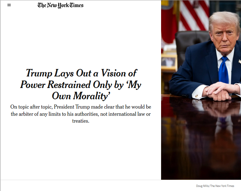 Trump told The New York Times in an interview published on Thursday that he did not “need international law,” and that he was relying on his own judgment instead. “My own morality. My own mind. It’s the only thing that can stop me,” he said.