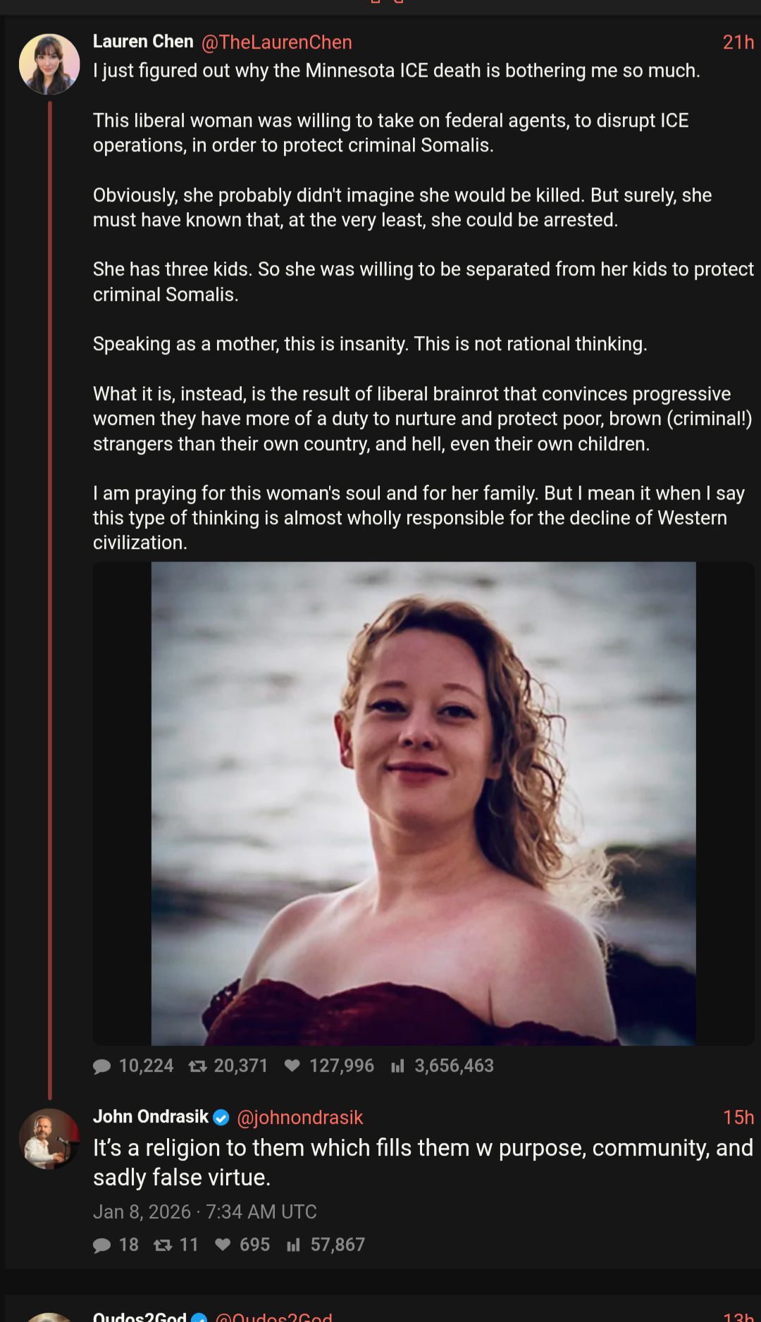 The right has spent decades building a self mythologizing victimhood around the cops killing the most odious, violent and threatening people alive (see: evil cult with a stockpile of machine guns in their basement) so the balls out defense of killing women they pulled out of their driveway too fast… well, the worst part is the hypocrisy!