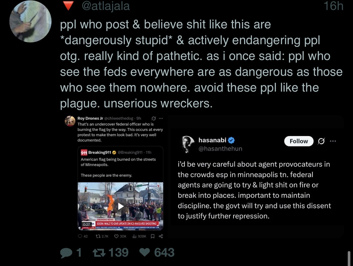 Going after some broke protesters mocking them who have no power and probably avoiding work to do these protest or some responsibilities while they don't have any political skills is the same shit. These are some well funded trained political groups. It's just people frustrated with what is happening so they are not going to operate perfectly. Focus on who is actually the problem. The fascists killing people, taking their rights and fucking them over