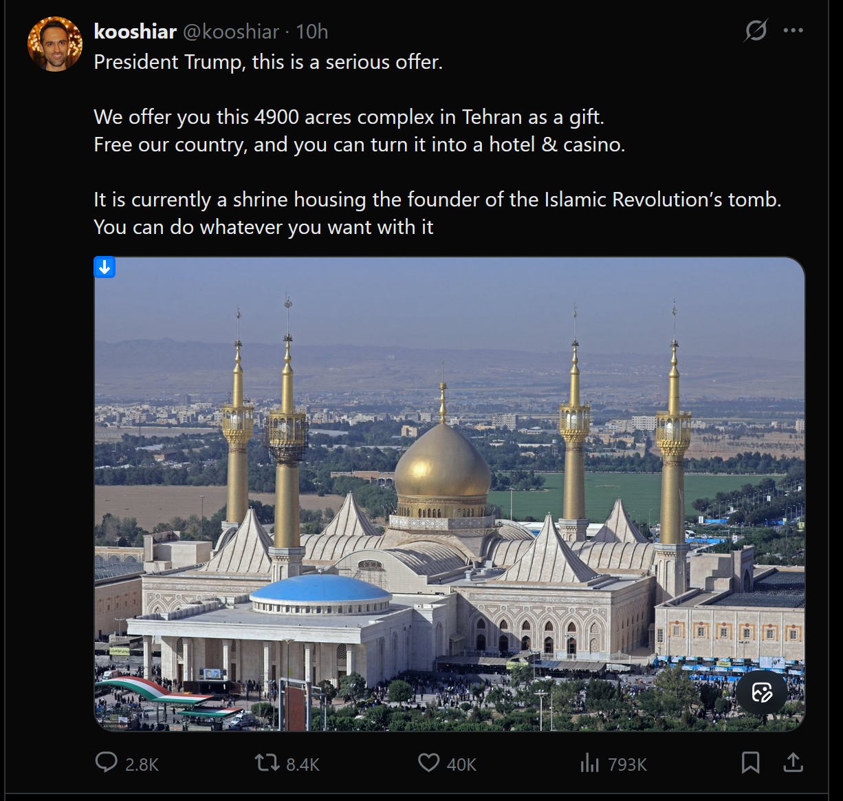 Iran is going to get fucking balkanized and "Persia" will be a monarchy directly funding Israeli settlements. All I can hope is that Pezeshkian will get killed in the civil war.