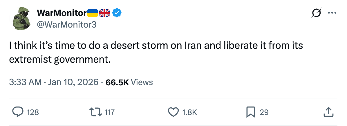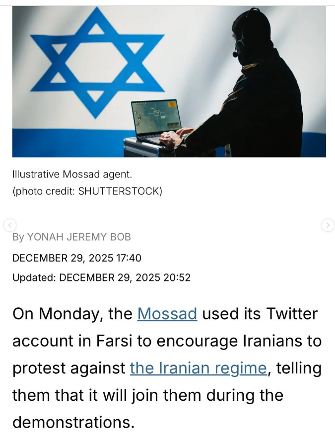 >Another factor in the unprecedented Western media campaign, despite its contradictions on the ground and the internet cutoff to Iran, is that it is not primarily directed at Iranians but toward the Western public, especially the American one, to prepare pretexts for war and demonize the other—the regime is killing its people…—although I lean toward the view that it is to convince Trump for the benefit of the Zionist Jewish entity more than anything.