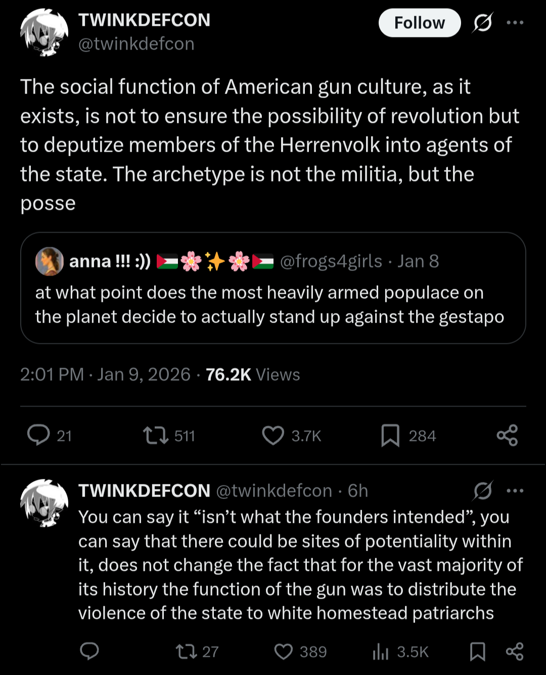 >>2638181To add more enriched plutonium to the TRVKE. It's all pretty much downstream from early American settler colonialism. Those "well regulated militias" got their start massacring and displacing natives.