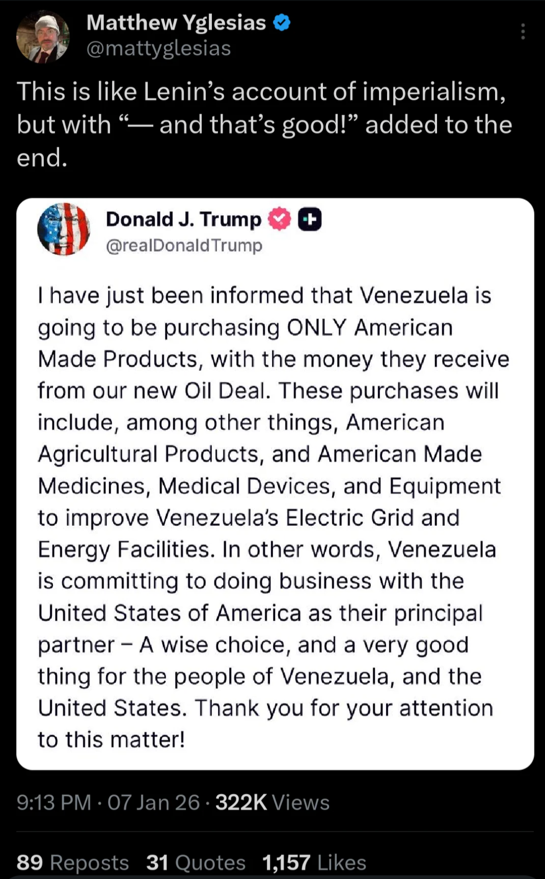>>2640650They actually tabled this legislation a couple times before Maduro was snatched but it didn't pass until after. At any rate I'm not trying to suggest that the Democrats are anti-imperialists, but they have been less hawkish relative to Trump on certain issues. It's important to have an accurate assessment of the conflicts between bourgeois parties to the extent that these exist.