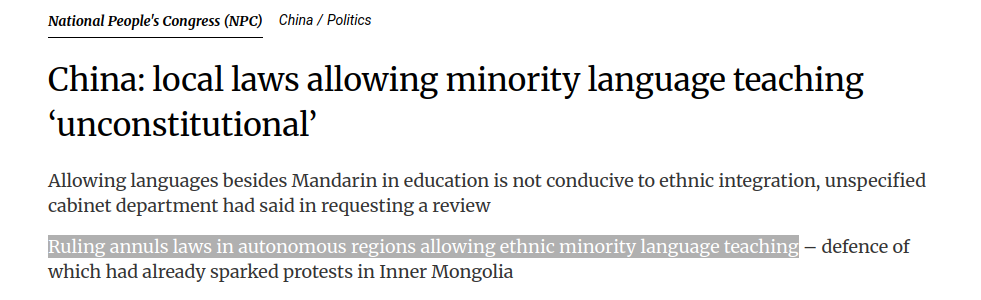 https://www.rfa.org/english/china/2024/12/12/china-madarin-wider-use/>>but they are still a manifestation of the Marxist-Leninist doctrine of respecting national sovereignty.They don't let them do whatever they want and are under tighter control than SSRs. Again it's all lipservice to placate ethnonationalists like yourself.