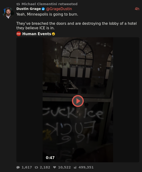 https://www.youtube.com/watch?v=4uWY3-lx_mwProtest at hotel in Minneapolis quartering the ICE goons dispatched by Trump to murder the residents of Minneapolis.