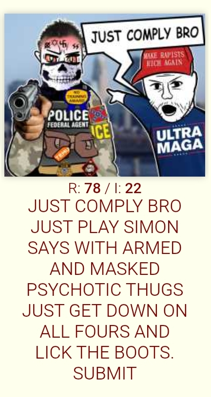 >>2640660Remember to call your democratic party representatives to complain when ICE shoots you in the face so they make a big fuzz in congress! I'm not trying to suggest they are pro-workers BUT…!