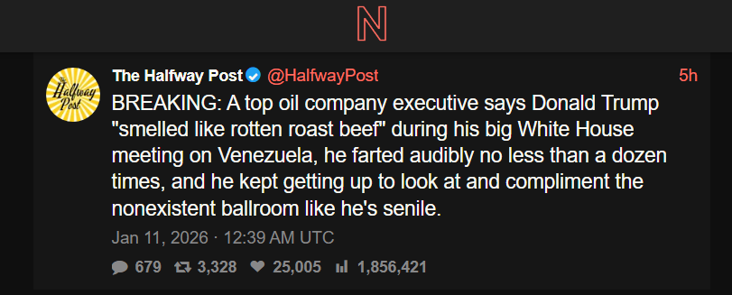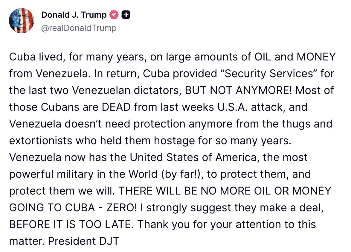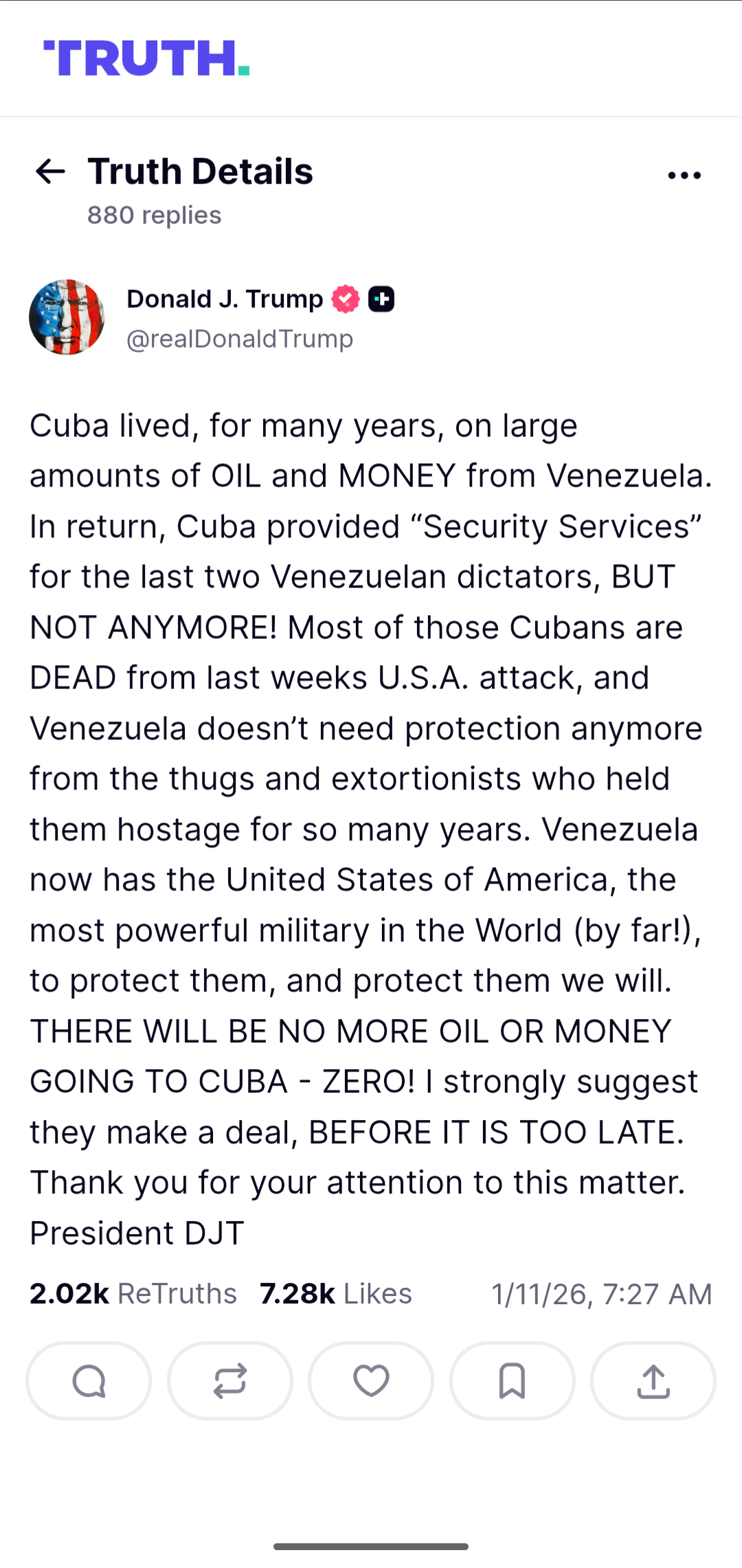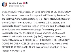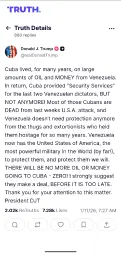 >Mr. Trump also shared a Truth Social user’s post that suggested that Secretary of State Marco Rubio should be Cuba’s president. “Sounds good to me,” Mr. Trump wrote. Mr. Rubio has long seen taking control of Venezuela as a way to force a governmental change in Cuba.https://archive.ph/zuFKL#selection-713.0-713.266>>2640966I wouldn't say they're less hawkish in general, in fact sometimes they're moreso (e.g. against Russia). It just seems like they're less so in this particular case.