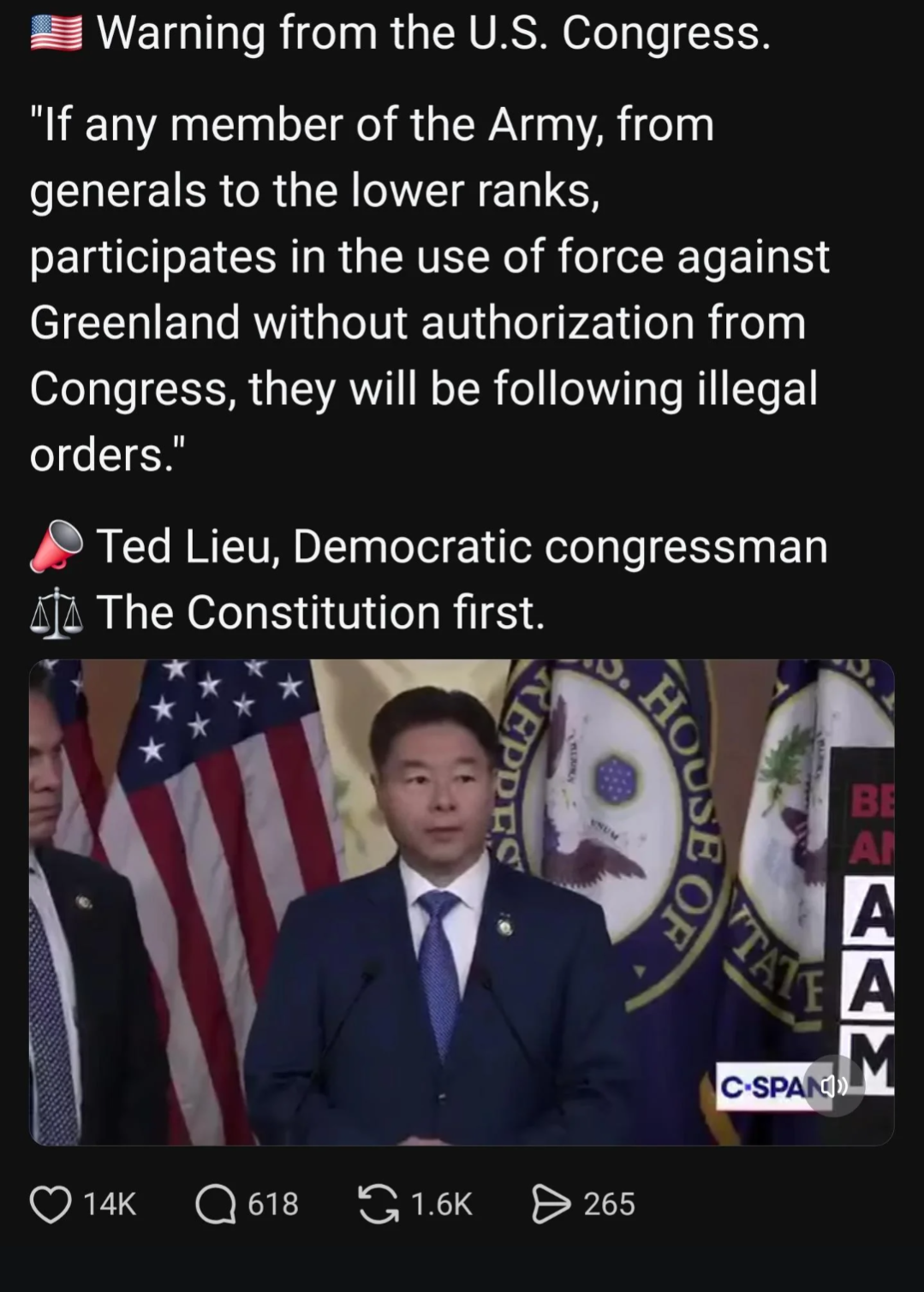 >>2640642Greenland is a self governing colony essentially. It makes its own domestic policy but is under Danish sovereignty. It's a moot point anyways since the Democrats moved to limit action against Venezuela too.