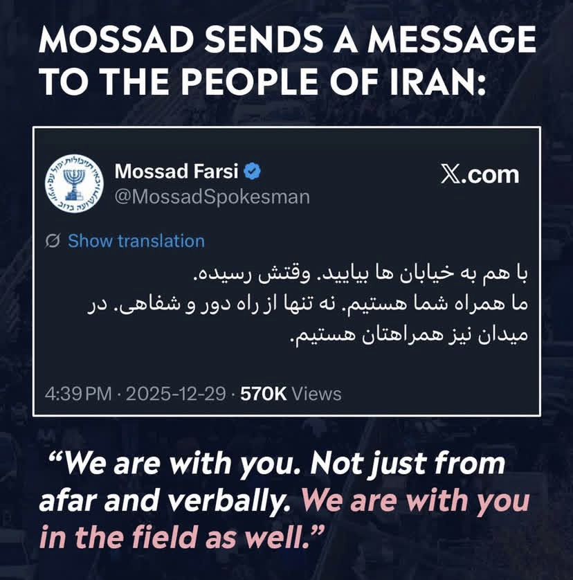 Mossad is one hell of an intelligence agency if it turned Iran into an economic basket case, convinced the Iranian regime that it's a good idea to alternately machine gun protestors and offer them $7 per month (lmao) to stop protesting, and basically created the perfect conditions for the biggest revolution in Iran since 1979. This "Mossad is behind the protests" seems to me almost like those "theories" about the world being run behind the scenes by the all-powerful Jewish bankers.
