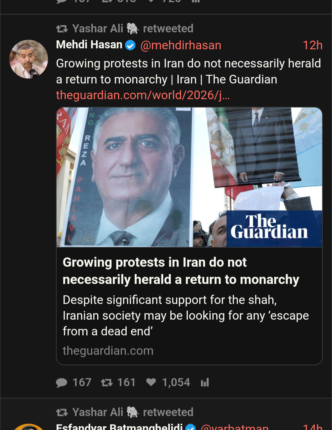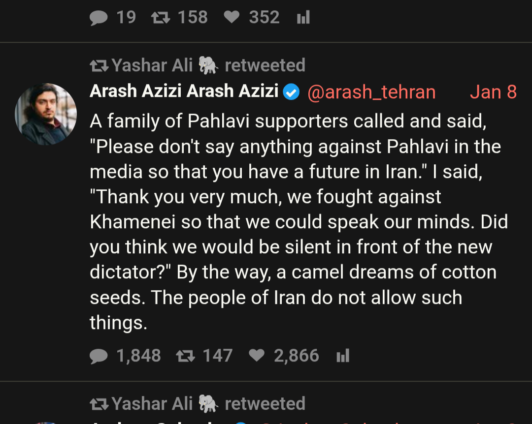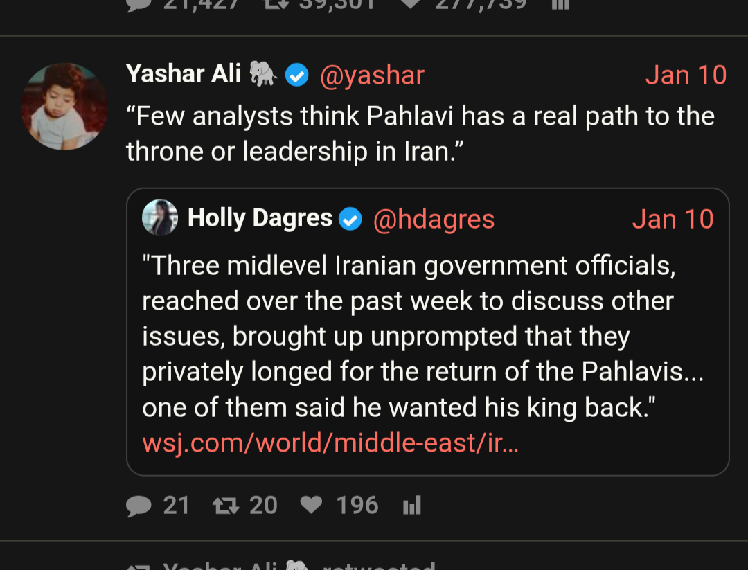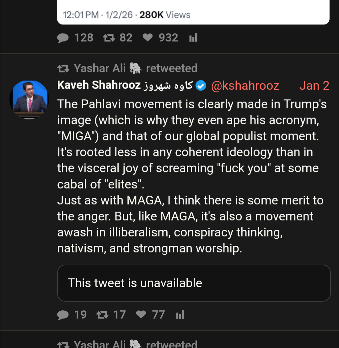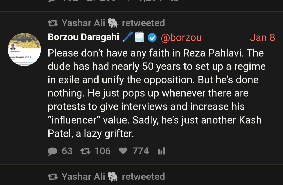 I like reading this guy stuff for updates about Iran currently. Yes, he's a liberal. Yes, he's a Democrat voter. Yes he has a lot of normie takes but also he's in iranian-american who despises monarchists and he hates the Shah so he says some interesting stuff about the ones who keep shilling the shah